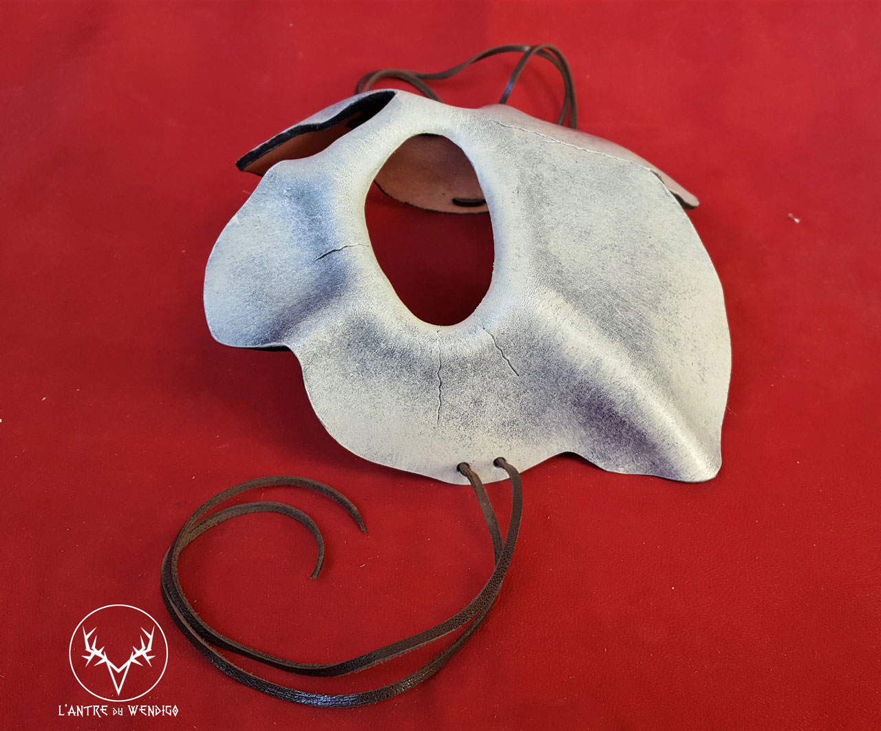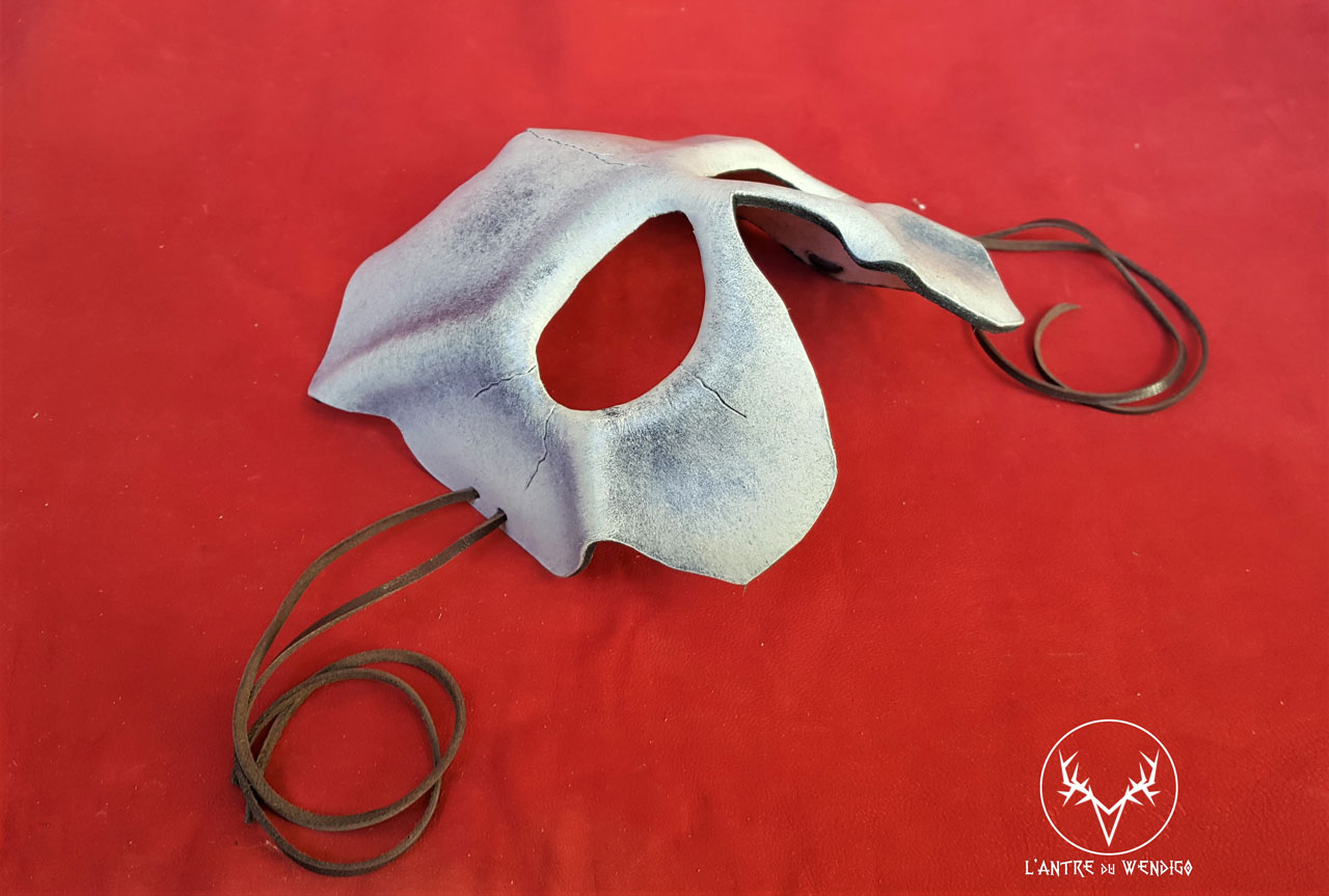 Réalisé en cuir et façonné à la main, il recouvre partiellement le visage tout en laissant la bouche et le menton dégagés. Cette conception permet de parler, manger, respirer et jouer confortablement tout au long d’un événement GN, sans nuire à l’immersion.